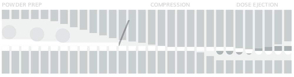 Our rotary turret uses proven tablet-press -based, principles. It progressively compresses powder into small pockets on a continuously rotating disk using a combination of rotors and pins. The resultant doses are then transferred to blister strip as it passes underneath the disk.